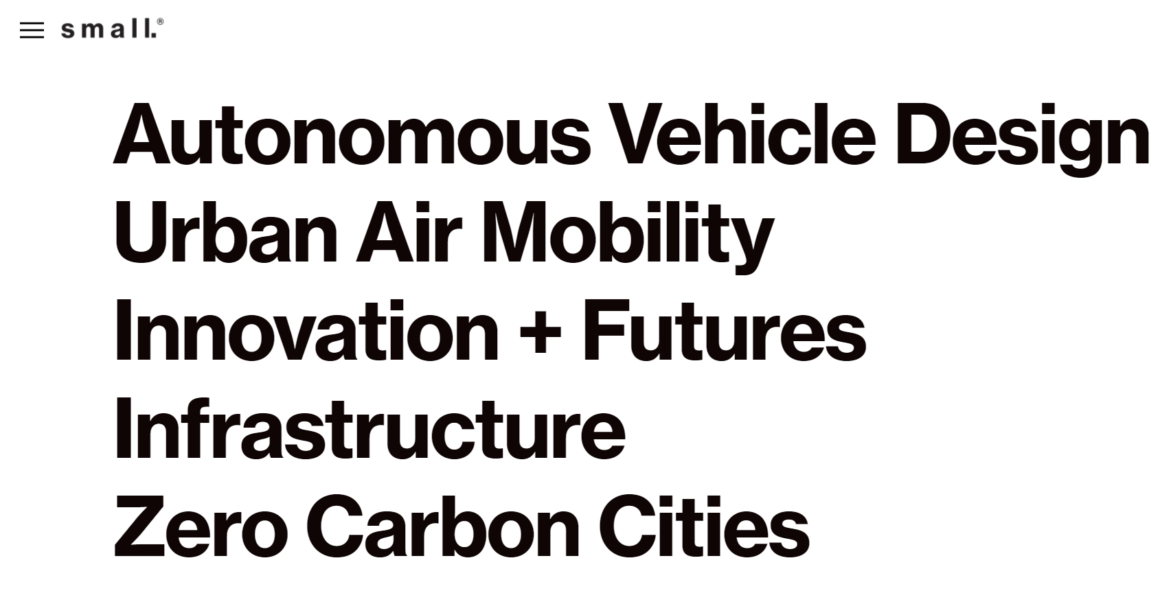 Small의 사업 영역입니다. 실제 제품 혹은 서비스를 만드는 것이 아닌 약간 건축회사(?), 디자인 쪽 회사으로 보여집니다. 특히 PBV와 도시 인프라는 현대가 제시한 내용과 상당히 유사합니다. 두 기업이 이미 협업을 해왔거나 혹은 한쪽이 영향을 받은 걸로 보여집니다.
